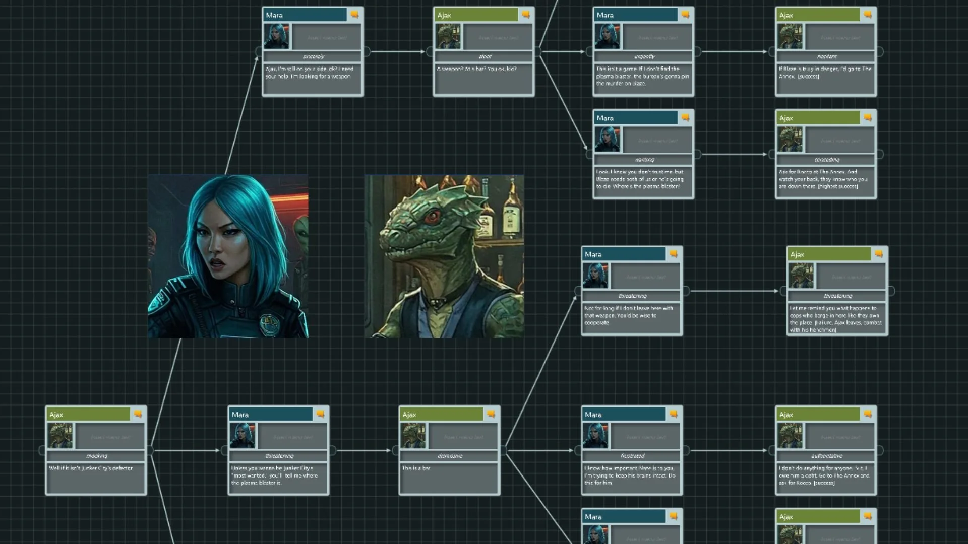 Mara (avatar) is an underdog space cop looking for a murder weapon, a plasma blaster. Ajax (NPC) is a weapons dealer who is suspicious of saying anything incriminating.